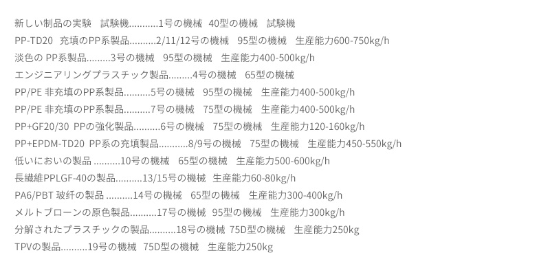 現在、会社には29本の二軸押出生産ラインがあります。その中にKRAUSS-MAFFEIはBRABENDER矢重秤を装備して、正確な制御を保証することができます。作業の現場には自動包装機、積み立つ機、自動配色秤量のシステムが標準装備されています。 高性能な改質のエンジニアリングプラスチックを生産できる